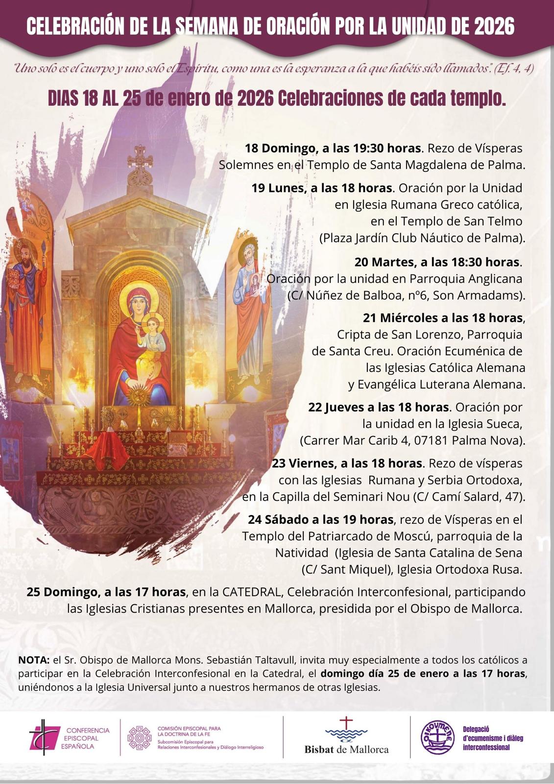 El bisbe de Mallorca, juntament amb el delegat d’Ecumenisme i Diàleg Interconfessional, i els representants de les diferents confessions cristianes presents a l’illa conviden tots els fidels de la diòcesi a participar activament en les celebracions programades i a unir-se en la pregària per la plena unitat dels cristians.